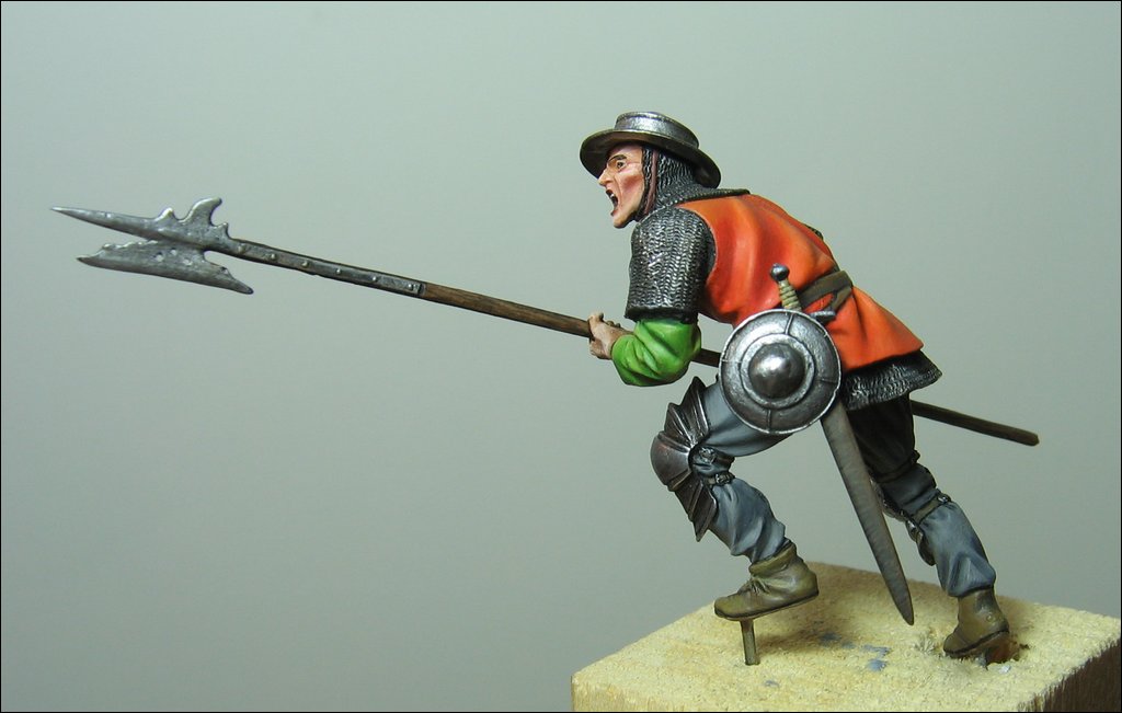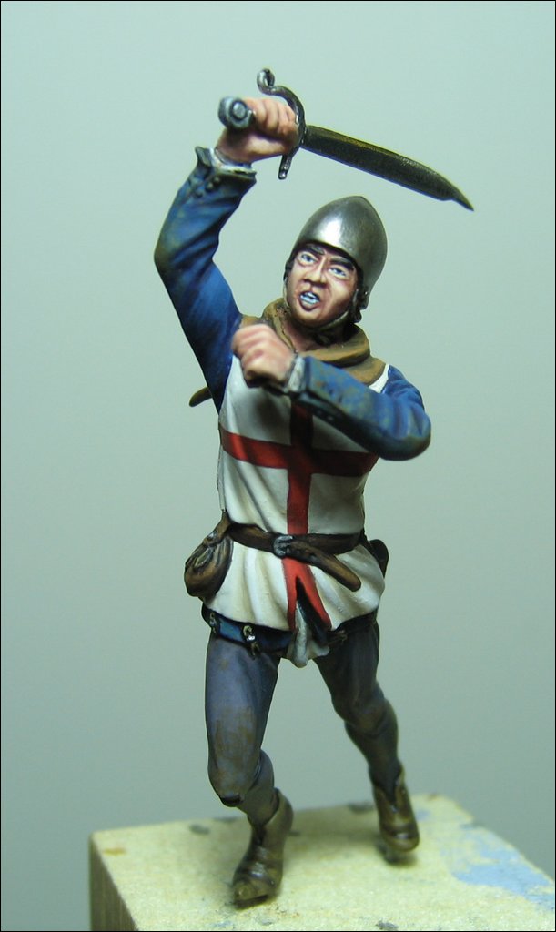 Il fante è l’altro elemento della scenetta Soldiers (SOL-SD02) ed è stato leggermente modificato nell’angolazione del braccio sinistro per permettergli di afferrare la mazza dell’avversario in questo drammatico corpo a corpo. Indossa una casacca recante la croce rossa su fondo bianco di S. Giorgio e brandisce una giusarma, tipica delle milizie di più basso rango.