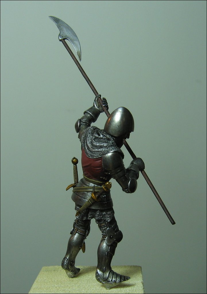 nella posa originale sta pugnalando con la destra un avversario, mentre con la sinistra ne blocca il braccio. Per potere riprodurlo nell’atto di brandire l’alabarda ho dovuto piegare il braccio sinistro e tagliare gli avanbracci a livello dei guanti per ruotare i polsi e cambiarne l’angolazione. E’ stato necessario anche ricostruire le dita della mano sinistra rovinatesi nel piegarle attorno all’asta. Le parti in metallo sono state lucidate.