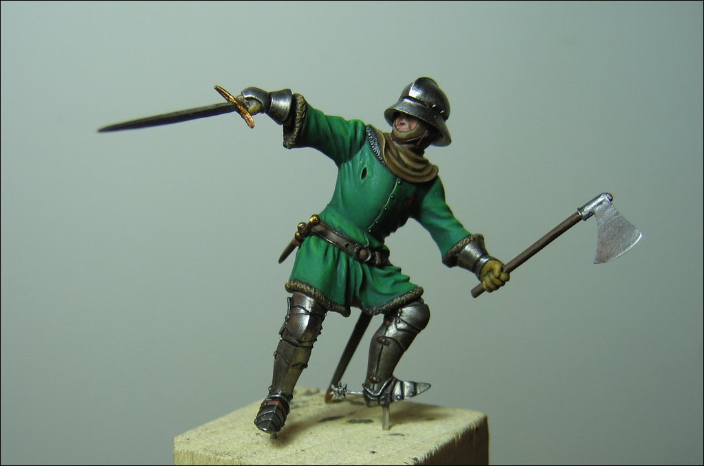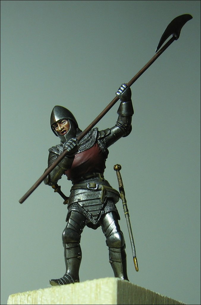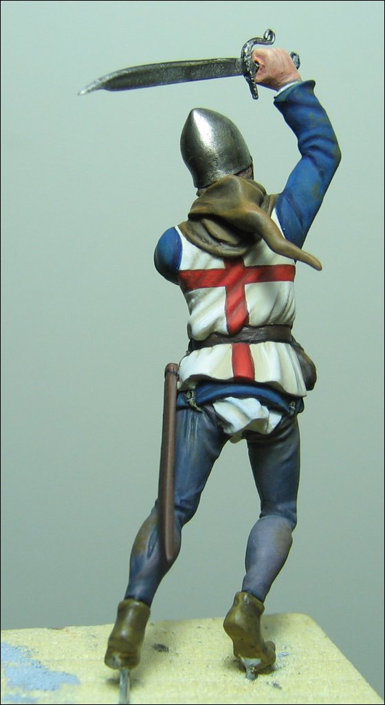 Il sergente deriva dalla scenetta Soldiers (SOL-SD03). Nell’originale il figurino tiene uno stendardo (che ho sostituito con un’ascia poiché volevo che l’Orifiamma fosse l’unica bandiera presente nel diorama) ed inoltre era posto su di un terreno in salita. Ho dovuto segare le gambe e rimontarle con un’altra inclinazione perché la figura potesse adattarsi al terreno piano. Rimaneva comunque una leggera inclinazione, in parte compensata da uno scudo inserito nel diorama sotto il suo piede e che ho sfruttato per una postura difensiva, il corpo all’indietro nel tentativo di evitare l’arma dell’avversario. Le parti in metallo sono state lucidate.