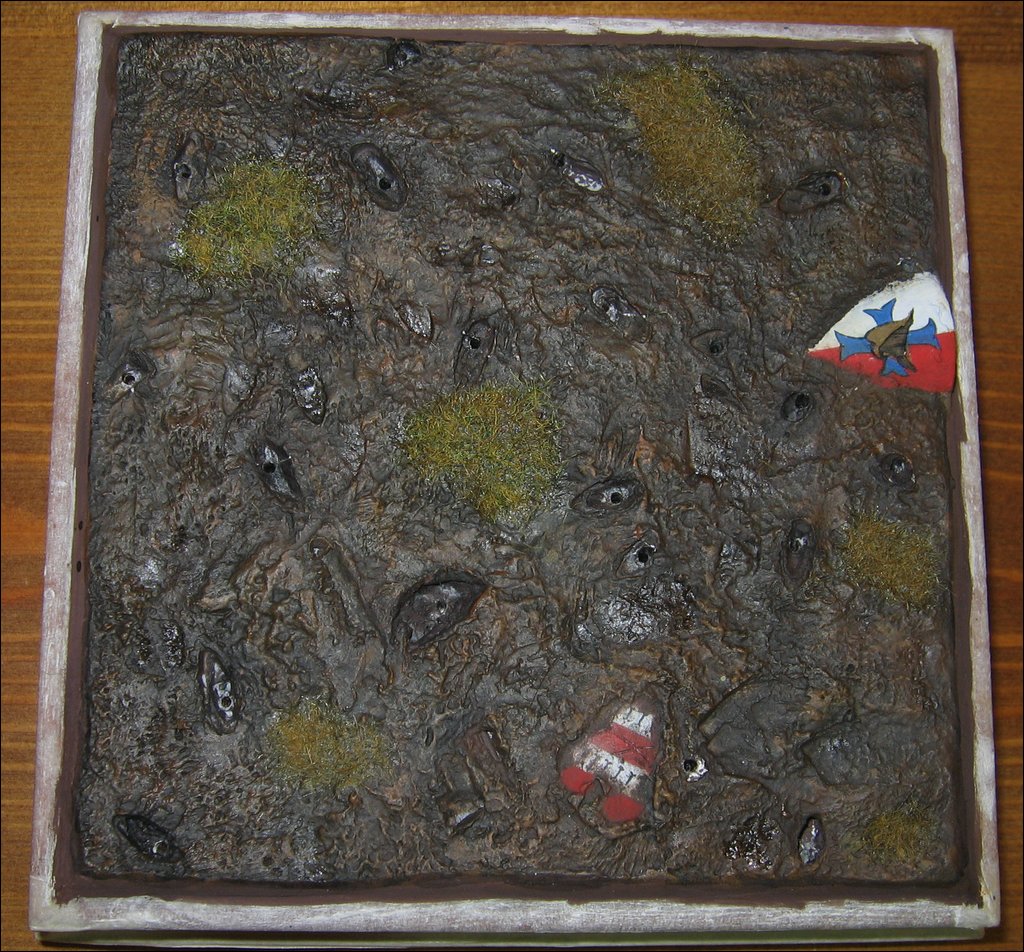 Il terreno è stato realizzato con il Das. Non è stato fatto in un’unica soluzione, ma poco alla volta, una porzione per ciascuna figura che via via preparavo per la pittura. Questo mi ha permesso di fare piccoli aggiustamenti nella collocazione dei personaggi. Sulla base di legno ho praticato tutti i fori per i perni inseriti nei piedi di ciascun figurino. Poi ognuno, prima della pittura, è stato adagiato nella porzione relativa di Das fresco per ottenere l’alloggiamento dei piedi e poi trasferito su una base provvisoria. Il Das fresco è stato testurizzato con uno spazzolino, creando anche delle impronte col piede di alcune figure. Il terreno è stato poi dipinto con marroni vari, usando alternativamente lavaggi e dry-brush. Ho anche inserito alcune zone d’erba (poche poichè il terreno era stato arato), alcune frecce (anche queste non molte poiché ci troviamo a ridosso della prima linea inglese) ed i famosi pali piantati dagli Inglesi.