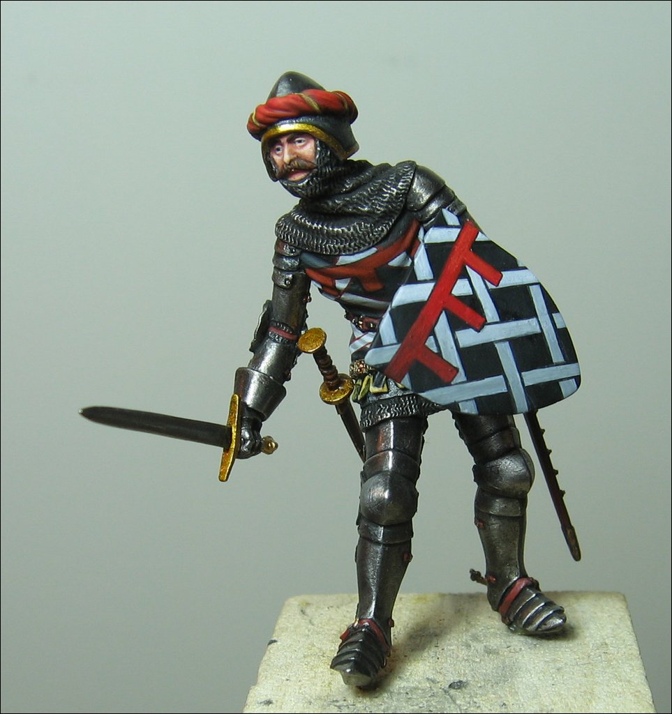 è il cavaliere di più alto lignaggio presente tra gli Inglesi e lo si vede dall’armatura ricca di decori, dal turbante costellato di pietre preziose e dal collare Lancasteriano. Era al comando di 40 uomini d’arme ed 80 arcieri a cavallo. Le sue armi sono inquartato 1 & 4 d’argento, tre losanghe unite rosse, 2 & 3 d’oro, un aquila ad ali spiegate verde. Il figurino appartiene al Kit Pegaso (PE-54-801) ed è stato dipinto tal quale. Le parti in metallo sono state lucidate.